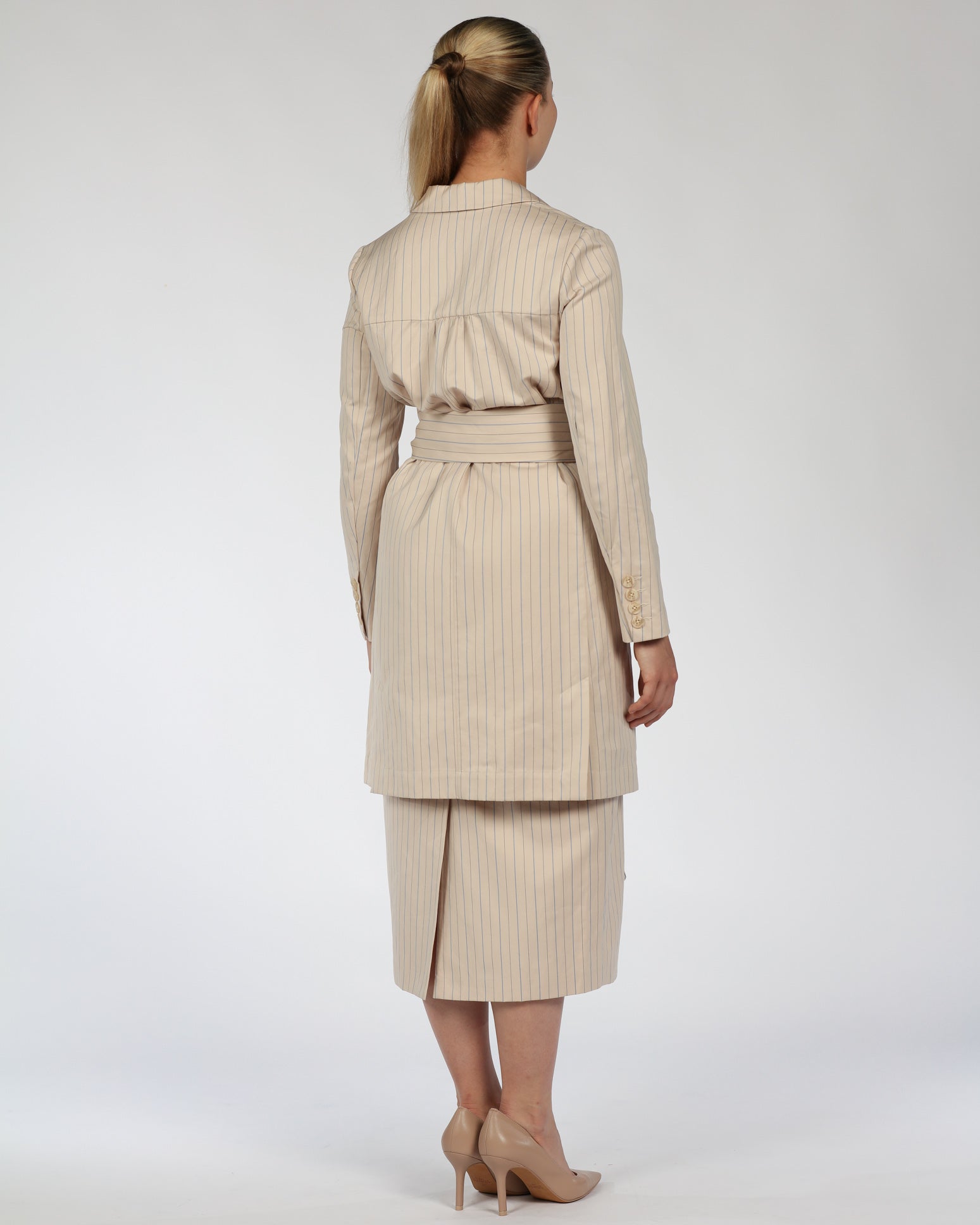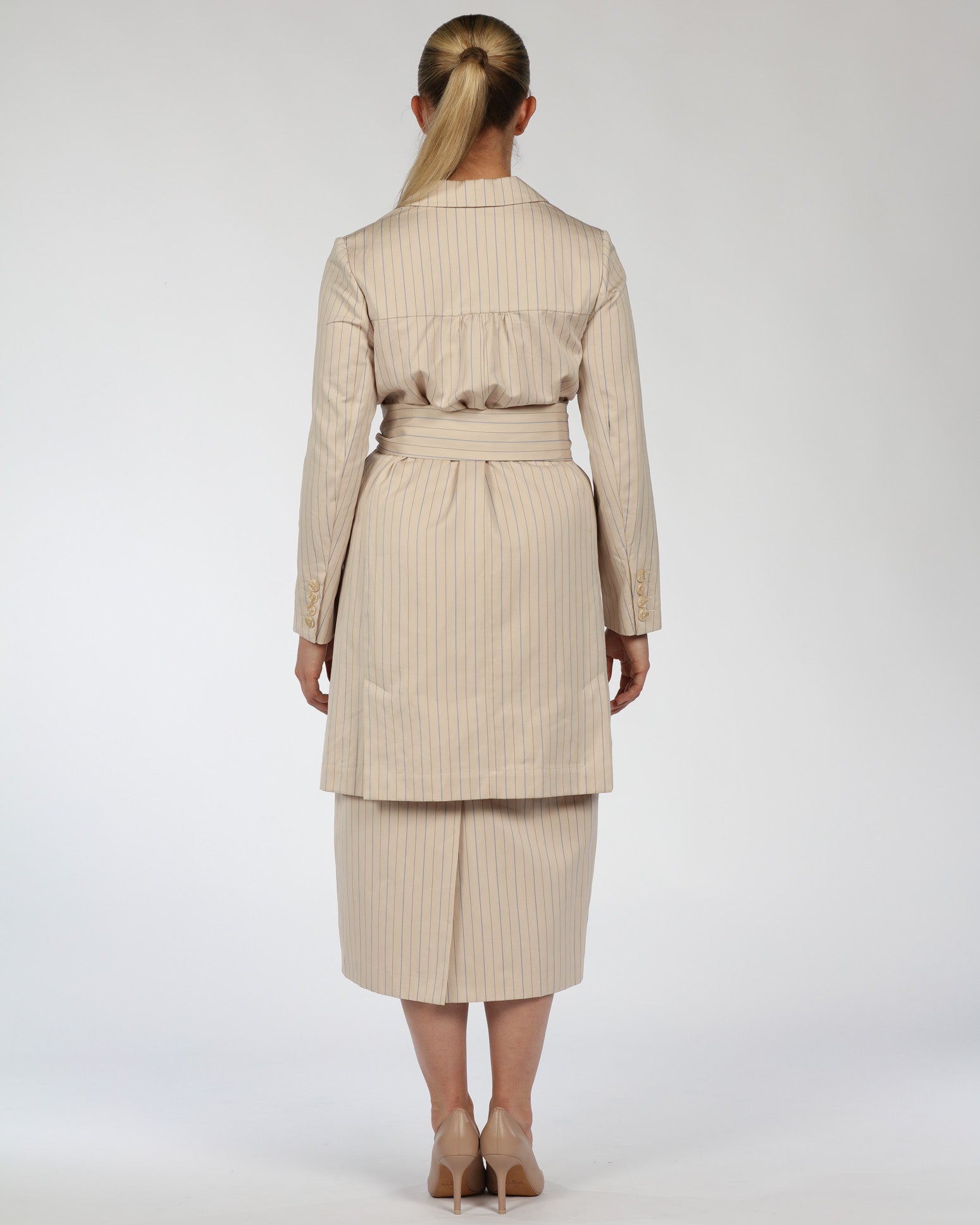 A versatile and timeless design crafted in breathable cotton, this midi dress features a soft nude base with elegant blue stripes. The fully lined skirt gives structure and comfort, while the detachable belt cinches the waist for a flattering silhouette.