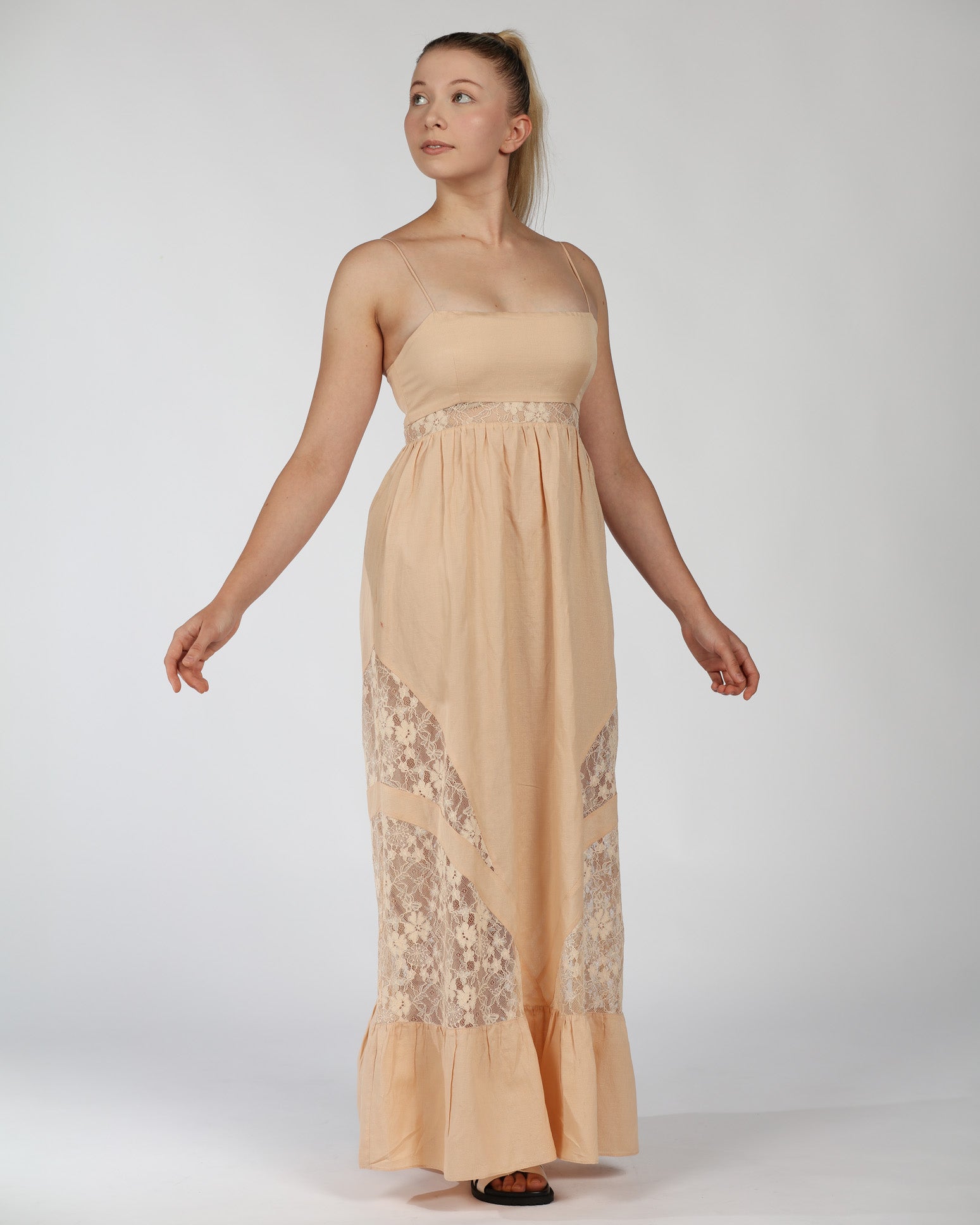 Embrace chic simplicity with this long slip dress, crafted from a linen–silk blend for a lightweight, breathable feel. Designed with fixed thin straps for a timeless touch, the flowing silhouette is beautifully elevated by delicate floral detailing at the centre, creating a look that is both effortless and refined.