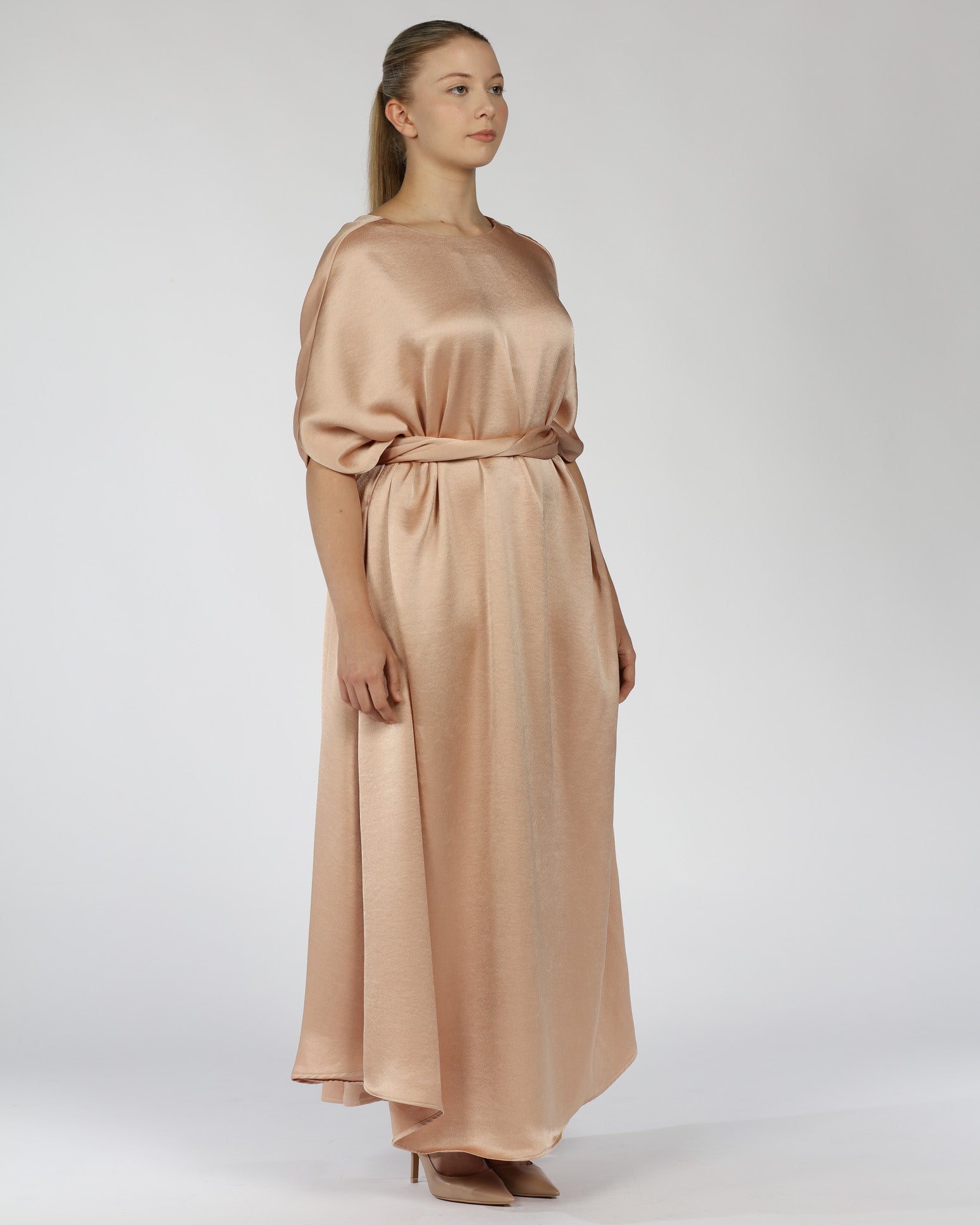 his long satin kaftan dress comes in a soft nude shade with a smooth finish and a relaxed drape. Designed with a round neckline and flowing sleeves, it offers an easy fit that can be worn loose or styled with the included belt for shape.