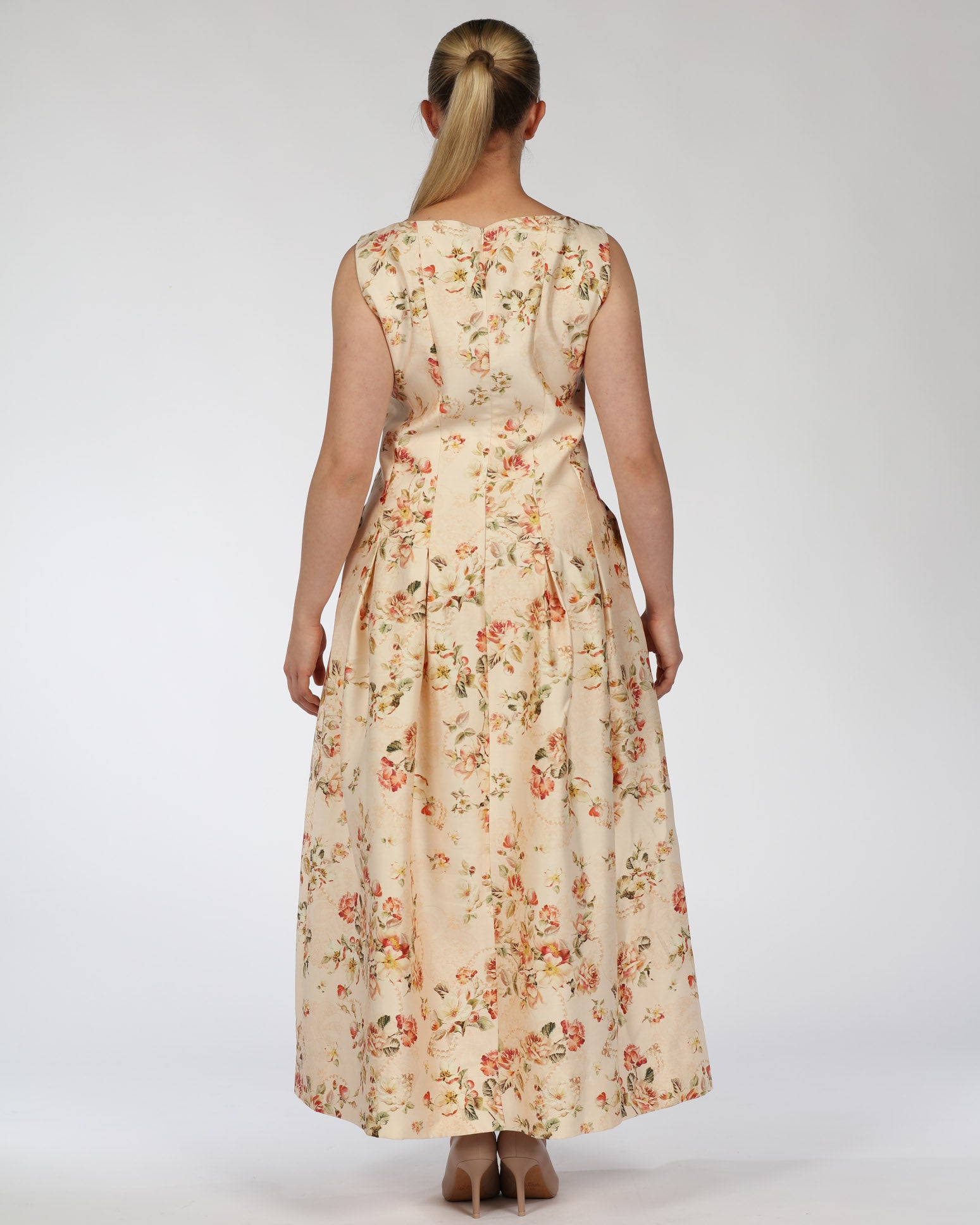 Crafted from a luxurious silk–linen blend, this floral midi dress blends elegance with everyday functionality. The sleeveless bodice features a flattering boat neckline, while the pleated skirt falls gracefully to mid-calf. Discreet in-seam pockets add a modern and practical touch, making it both stylish and versatile.