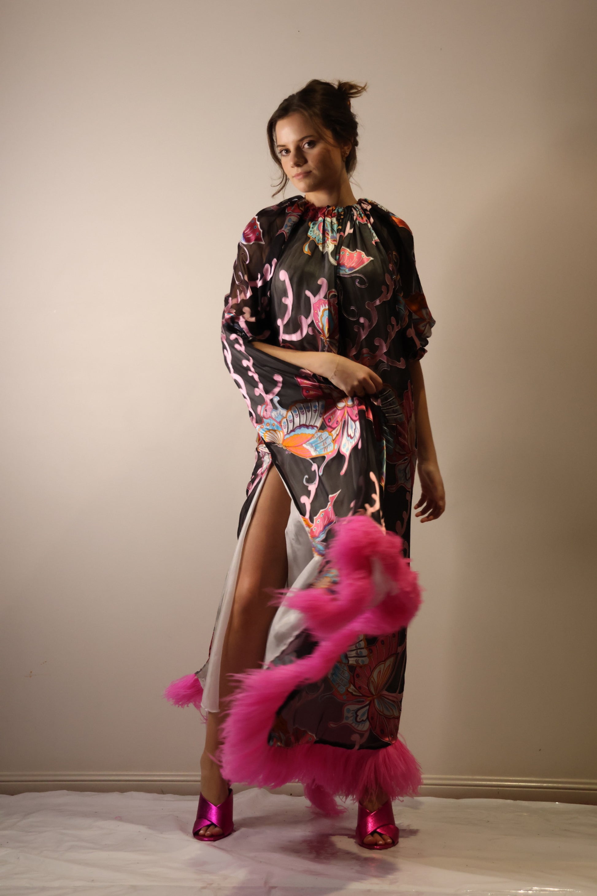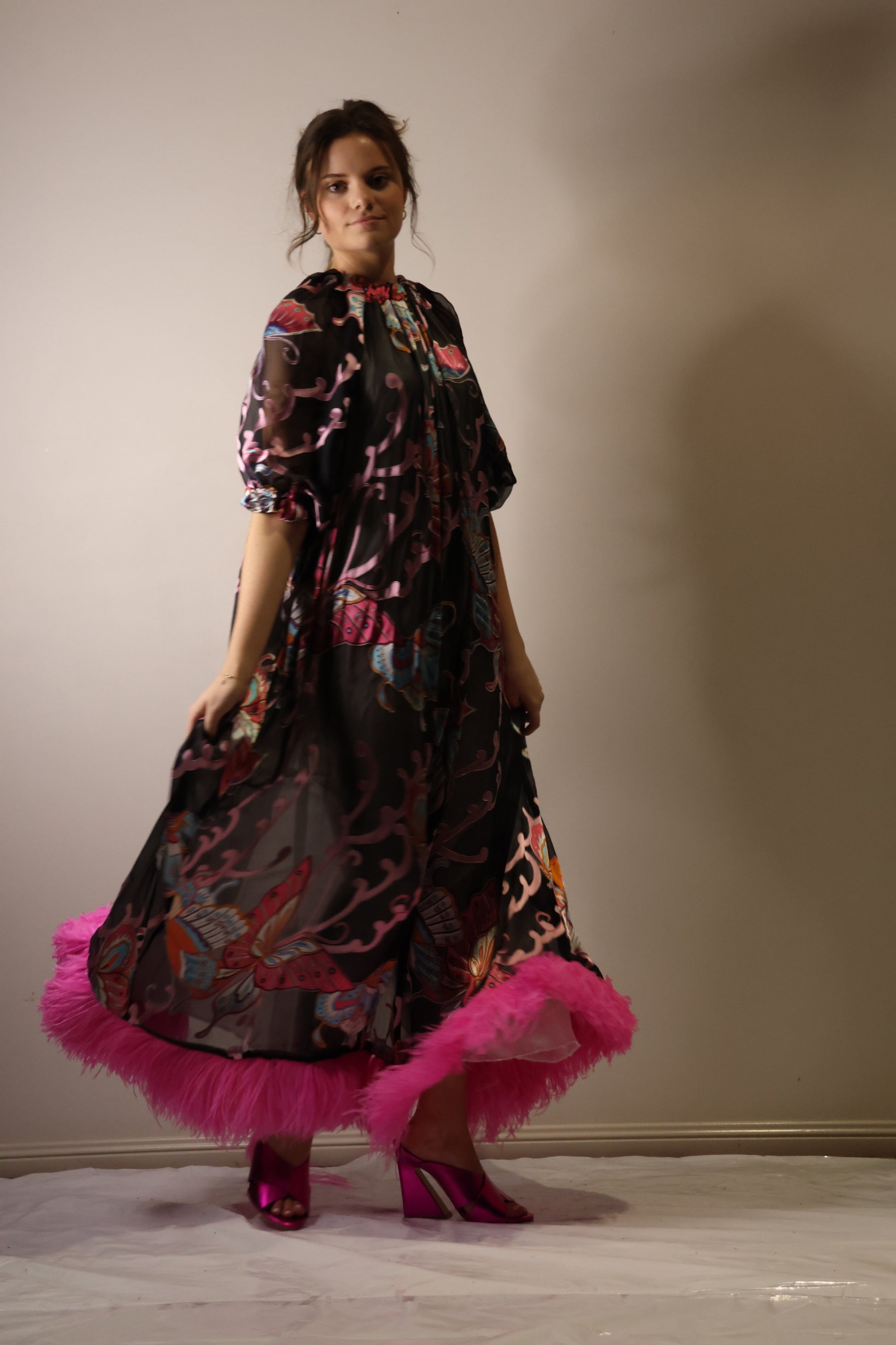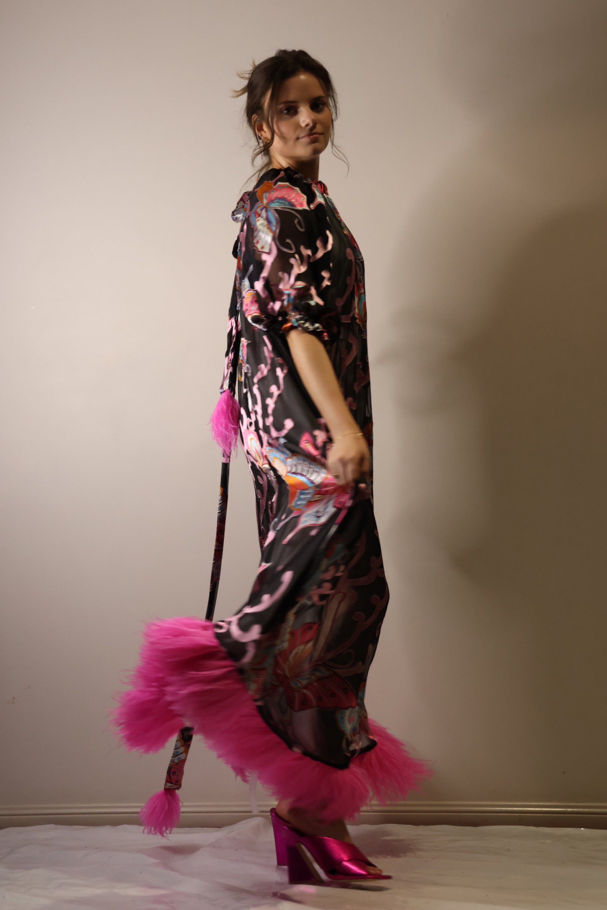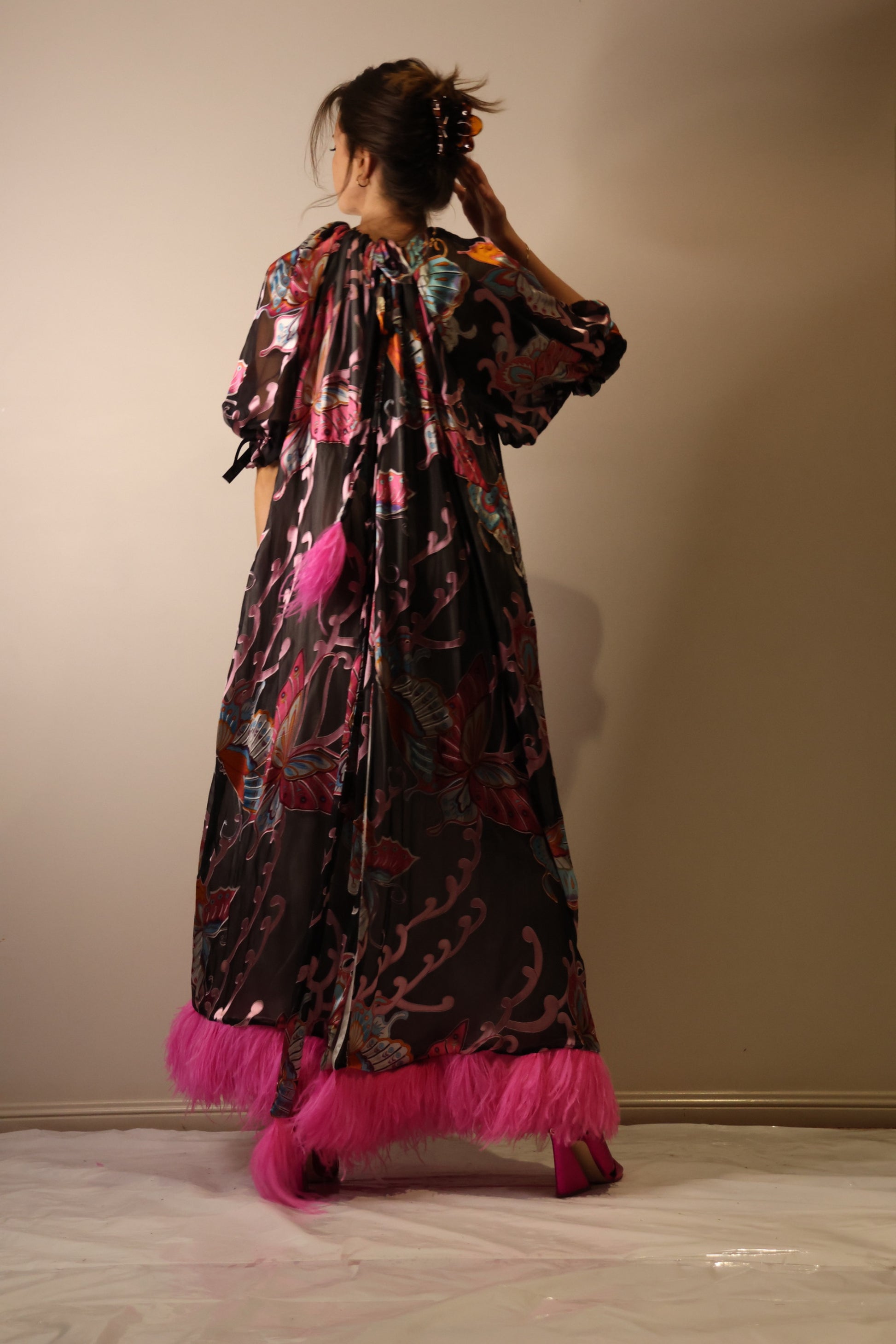 An exquisite full length caftan dress, detailed with ostrich feathers, tie around neck and free flowing form.